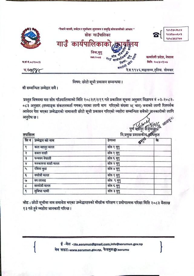 करार कर्मचारी भर्ना सम्बन्धि सूचना ।(कृषि प्राबिधिक सहायक चौथो )